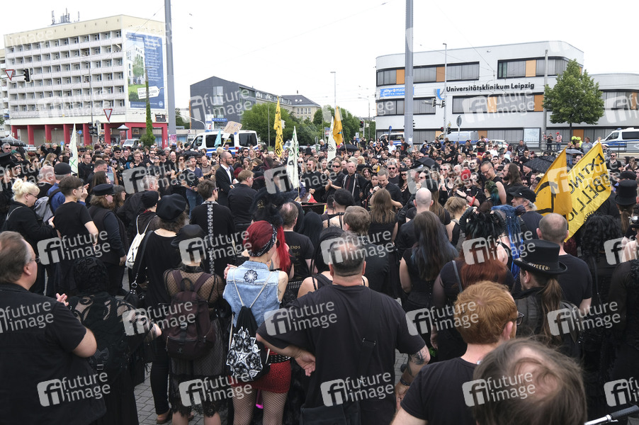 Besucher des 28. Wave-Gotik-Treffens und Klimaaktivisten der Klimaschutzbewegung Extinction Rebellion bei einem gemeinsamen Trauermarsch für aussterbende Arten mit anschliessenden Die-In. Leipzig, 10.06.2019