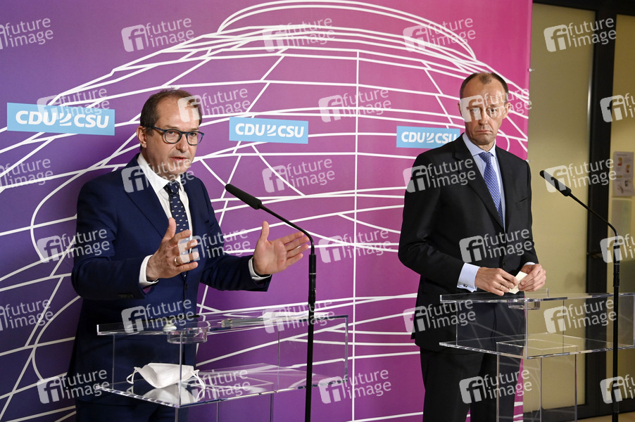 Alexander Dobrindt und Friedrich Merz beim Statement der CDU/CSU-Bundestagsfraktion nach der fraktionsoffenen Sitzung auf der Fraktionsebene im Reichstagsgebäude. Berlin, 24.02.2022