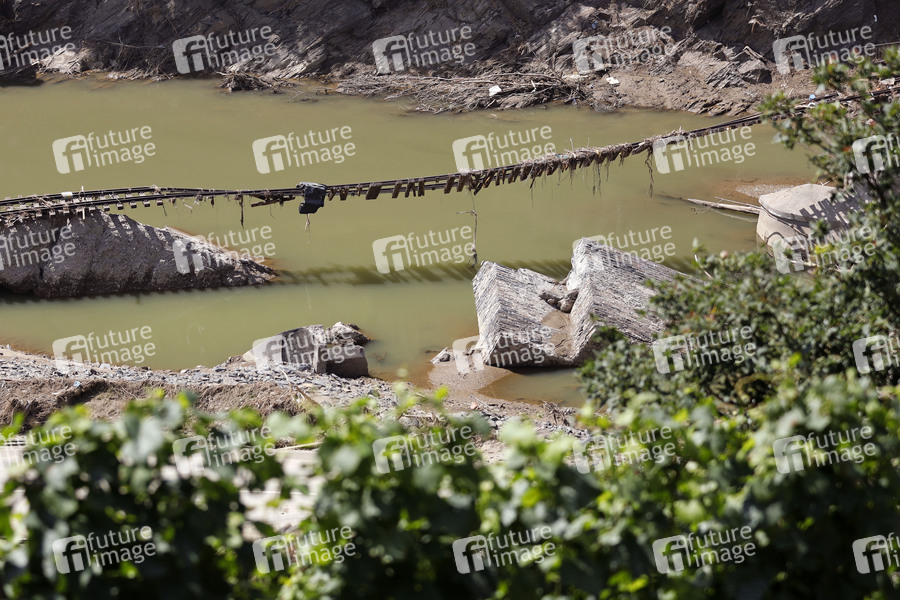 Nach dem Jahrhunderthochwasser in der Eifel durch heftige Regenfälle und Dauerregen mit Überschwemmungen und Überflutungen haben die Aufräumarbeiten im Ahrtal große Fortschritte gemacht. Einheiten von Polizei, THW, Bundeswehr und Feuerwehr mitsamt vielen freiwilligen Helfern haben Straßen geräumt, Schutt und Schlamm entfernt und die Menschen versorgt. Der Wiederaufbau wird trotzdem Jahre dauern. Im Bild Flutschäden an einer Eisenbahnbrücke nahe der Ortschaft Rech, in der die Flut viele Häuser zerstörte, 30.07.2021