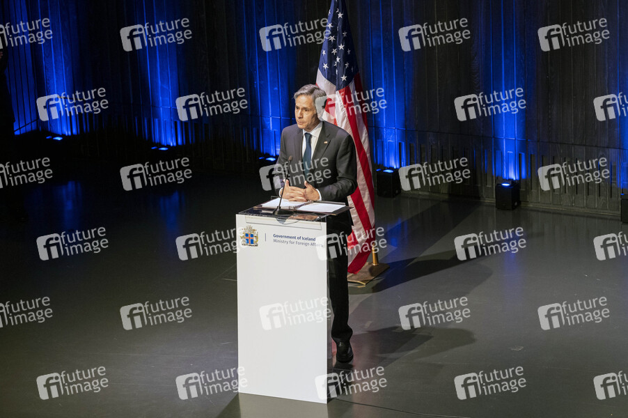 Außenminister Antony Blinken (USA) nach dem Treffen mit dem isländischen Außenminister bei einer Presskonferenz am Rande der Sitzung des Arktischen Rates in der Harpa. Reykjavik, 20.05.2021