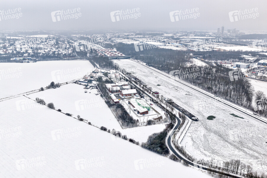 Hannover Anderten, Kanal, Wasserstraße, Gewässer, Eis, gefroren, zugefroren, Schneetreiben, Winter, gefrierende Nässe, Kälteeinbruch, Schneefall, Schnee, Schneegrenze, Schneematsch, Glätte, glatt, Frost, Wetter, Glättegefahr, Glatteis, Glatteisgefahr, Temperatursturz, Winterdienst, Streusalz, Schneeglätte, Deutscher Wetterdienst, winterlich, kalt, Schnee-Chaos, Luftaufnahme, Luftbild, Drohne, Drohnenaufnahme, Themenfoto, Symbolbild, Themenbild, Symbolfoto
