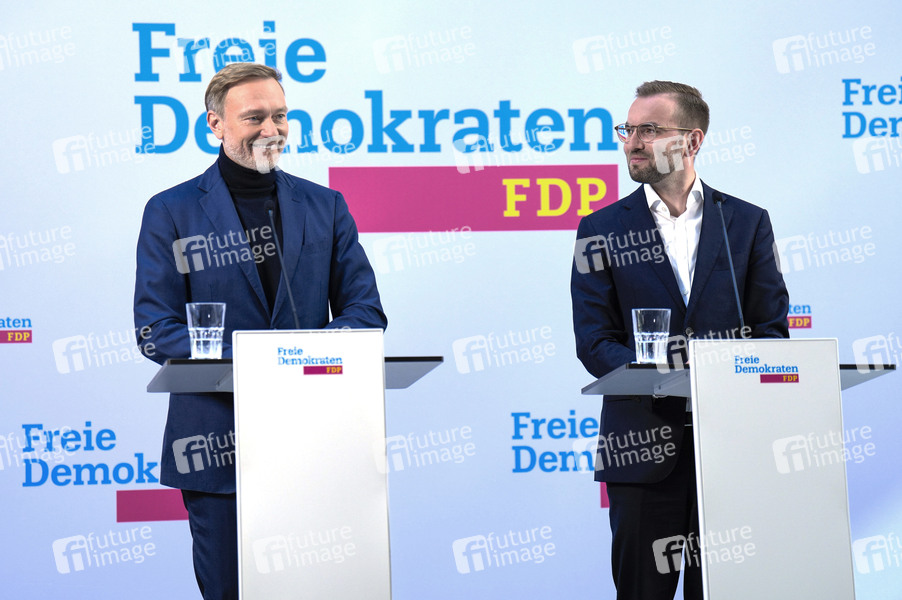 Christian Lindner und Zyon Braun bei der Pressekonferenz der FDP zur Landtagswahl in Brandenburg im Hans-Dietrich-Genscher-Haus. Berlin, 23.09.2024