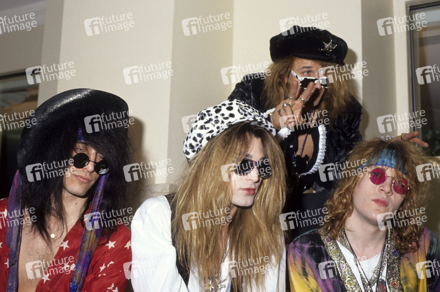 Derek Frigo, Vik Fox, Chip Z'nuff und Donnie Vie von Enuff Z'Nuff bei einem Photoshooting im Columbia Hotel. London, 26.04.1990