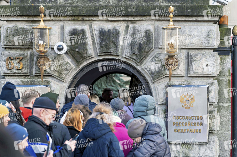 Zeitgeschehen, Schlange, Menschen, Russen, Menschenmenge, Botschaft, Russische Botschaft, Abstimmung, Demo, Demokratie, Demokratiebewegung, Demonstrant, Demonstranten, Demonstration, Demonstrierende, Demos, Konflikt, Konflikte, Kundgebung, Kundgebungen, Militär, Oppositionelle, Oppositionspartei, Oppositionspolitiker, Politik, Präsidentschaftswahl, Protestaktion, Protestdemo, Protestdemonstration, Protestkundgebung, russisch-ukrainischer Krieg, Russland, Solidarität, Solidaritätsbekundung, Solidaritätsdemo, Solidaritätsdemonstration, Solidaritätskundgebung, Ukraine, Ukrainekrieg, Versammlung, Wahlen