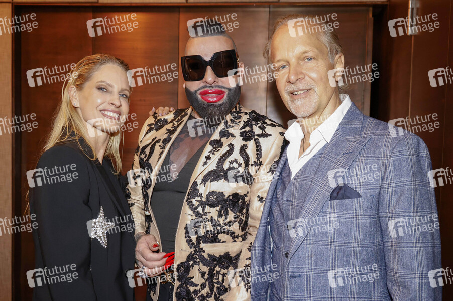 Tina Ciamperla, Harald Glööckler und Jochen Horst beim exklusiven Dinner von Harald Glööckler und der Vorstellung seiner Muse Tatiana Makarova im Hotel SO/ Berlin Das Stue. Berlin, 09.05.2025