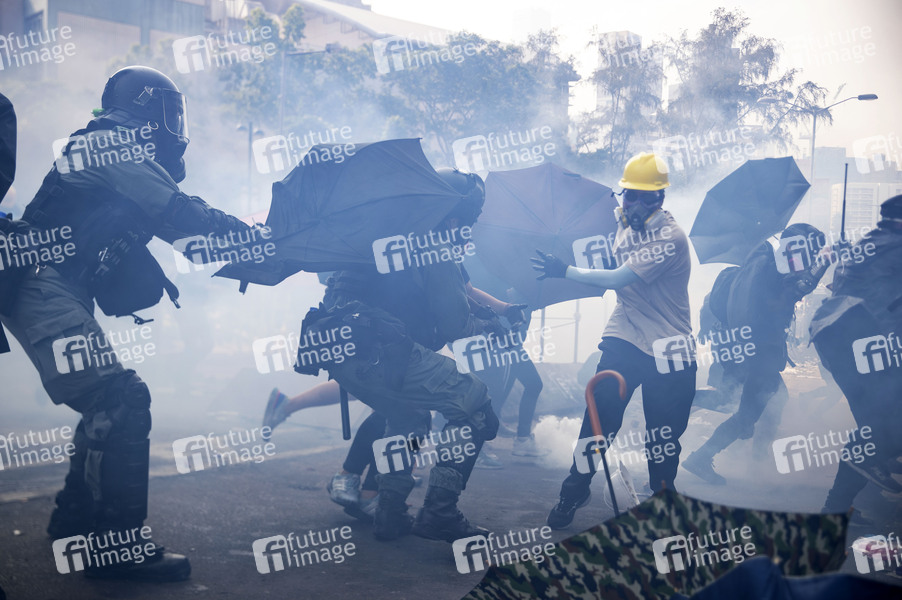 Die Polizei verhaftet Studenten, während sie versuchen den Campus zu verlassen - Belagerung an der Polytechnischen Universität. Die Polizei umstellt den Campus der Universität, nachdem Demonstranten den Cross-Harbor-Tunnel und die Hauptstraße außerhalb des Campus blockiert haben. Hongkong protestiert seit fünf Monaten ununterbrochen. Am Montag, dem 11. November 2019, begann ein Streik in der ganzen Stadt, der Teile von Hongkong zum Erliegen brachte, als MTR-Stationen geschlossen und mehrere Straßensperren errichtet wurden. Hongkong, 18.11.2019