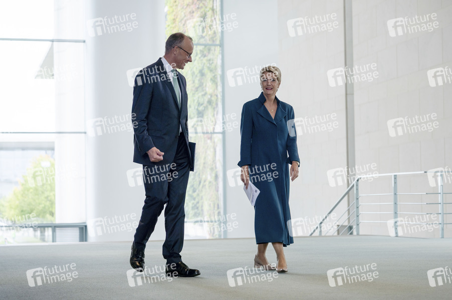 Friedrich Merz und Karin Keller-Sutter beim Empfang der Bundespräsidentin der Schweiz mit militärischen Ehren zu einem gemeinsamen Gespräch mit anschließendem Pressestatement im Bundeskanzleramt. Berlin, 02.09.2025