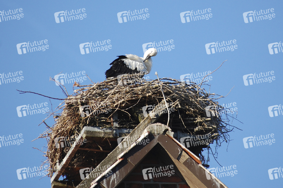 Junger Storch putzt sich in seinem Nest auf einem Dach in Neustadt am Rübenberge, Ortsteil Mecklenhorst