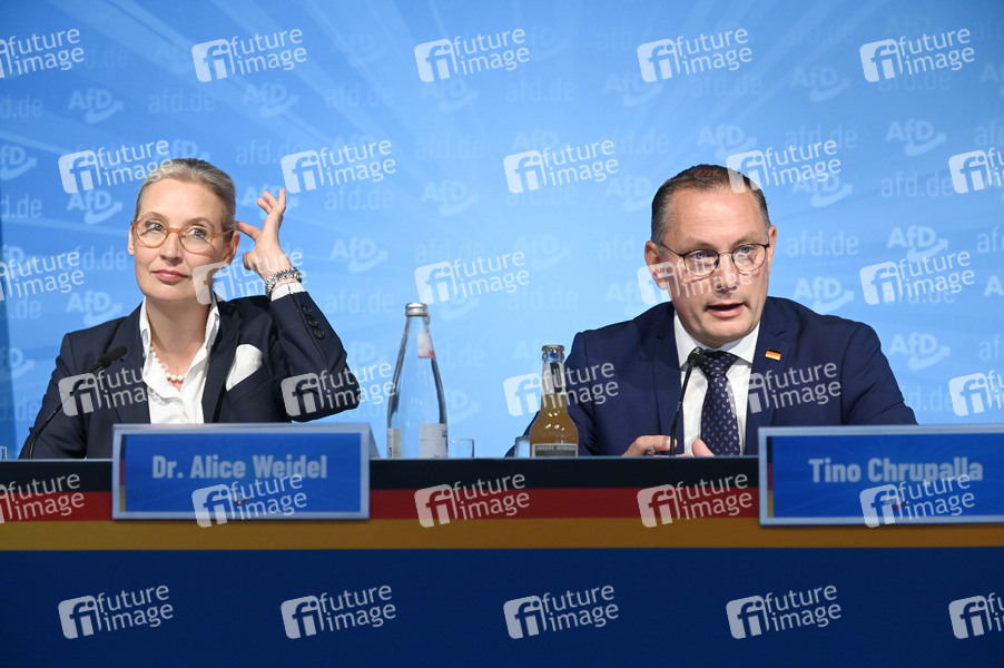 Alice Weidel und Tino Chrupalla bei der Wahlnachlese der AfD nach den Landtagswahlen in Thüringen und Sachsen in der AfD-Bundesgeschäftsstelle. Berlin, 02.09.2024