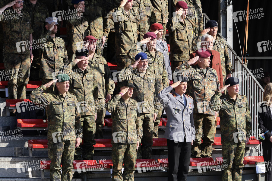 Soldaten bei einem Appell für die Soldatinnen und Soldaten der Evakuierungsmission in Kabul und dem Feierlichen Gelöbnis von Rekruten des Fallschirmjägerregiments 31 in der Fallschirmjägerkaserne Seedorf. Seedorf, 22.09.2021