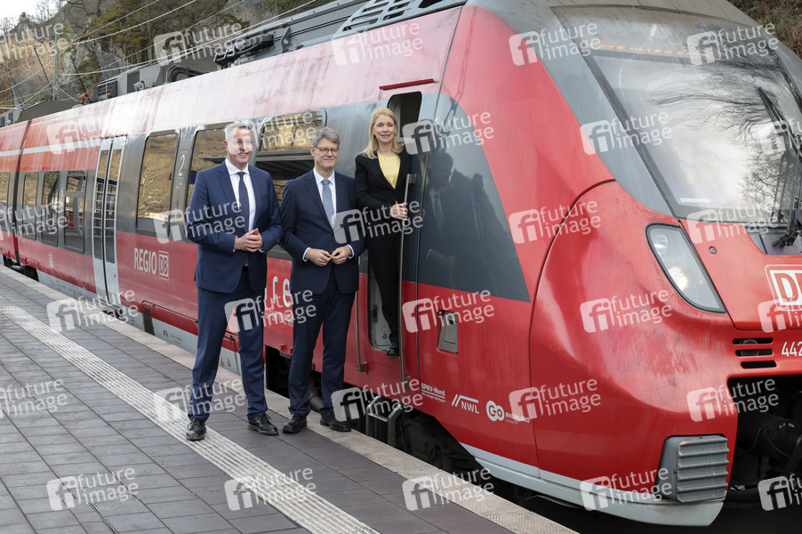 Alexander Schweitzer, Patrick Schnieder, Evelyn Palla bei der Inbetriebnahme der neuen Ahrtalbahn mit Sonderfahrt von Dernau nach Altenahr. Altenahr, 12.12.2025