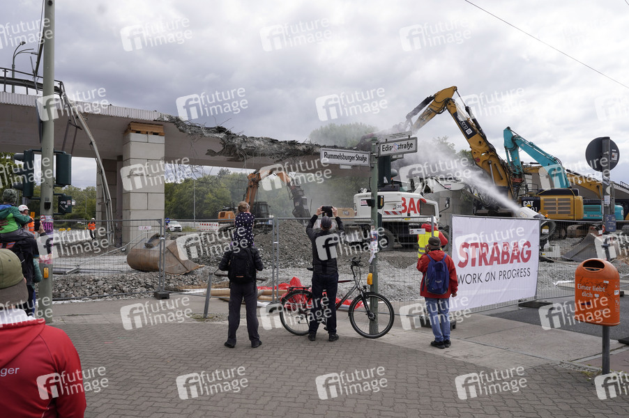 Der Abriss der maroden Brücke an der Wuhlheide (Oberschöneweide) geht zügig voran. Bereits am 2. Tag wird schon ein Teil der Brücke abgerissen. Die kaputte Brücke soll schnellstmöglich entfernt werden mit dem Ziel, die Freigabe der blockieren Straßenbahntrasse und Wiederherstellung des Fuß- und Radverkehrs zwischen Treskowallee und Edisonstraße möglichst bis zum 30. Mai. Berlin, 24.05.2025