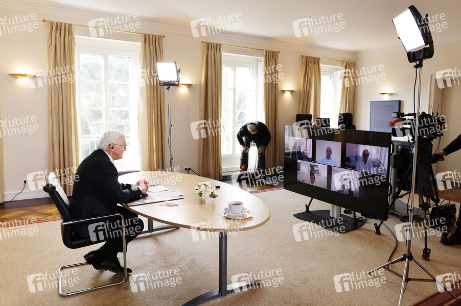 Frank-Walter Steinmeier bei einem Regionalgespräch des Bundespräsidenten mit Bürgern aus Sachsen zur Situation im Gesundheits- und Pflegebereich in der Pandemie (Videoschalte) im Schloss Bellevue. Berlin, 18.02.2021