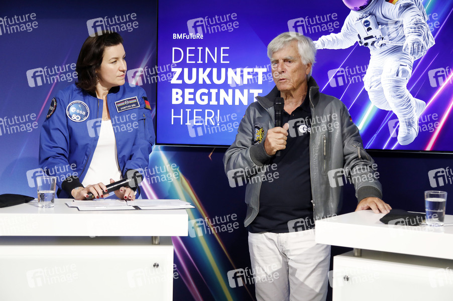 Dorothee Bär und Ulf Merbold beim Tag der offenen Tür der Bundesregierung im Bundesministerium für Forschung, Technologie und Raumfahrt. Berlin, 23.08.2025