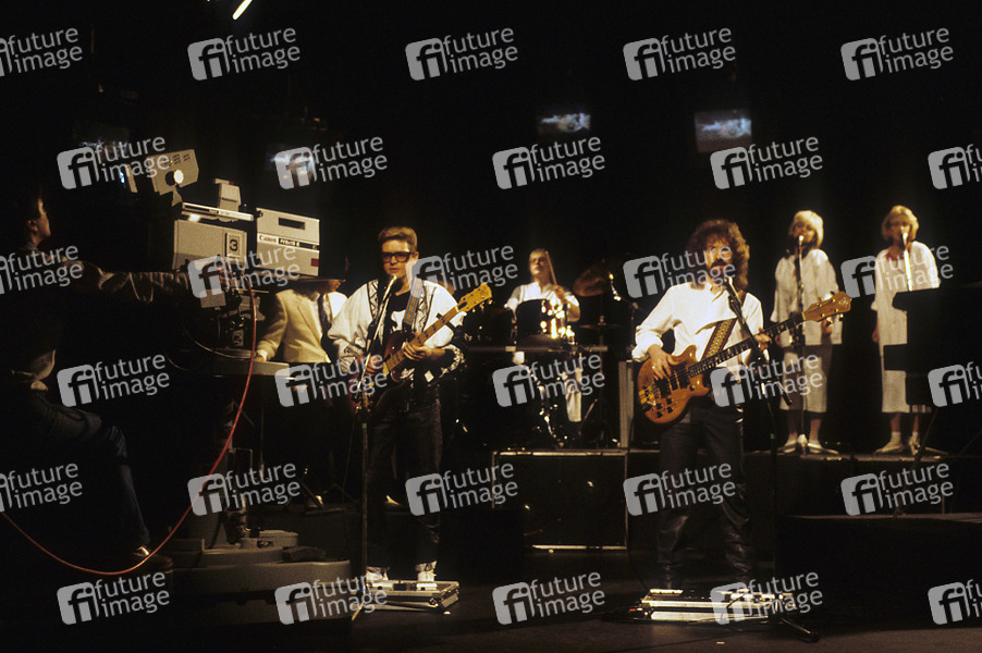 Bias Boshell, John Lees, Mel Pritchard und Les Holroyd von Barclay James Harvest bei den Dreharbeiten zum Musikvideo von 'Victims of Circumstance' in den Ewart Studios. London, 28.03.1984