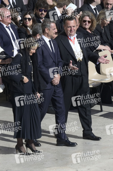 Kyriakos Mitsotakis mit Ehefrau Mareva Grabowski-Mitsotakis bei der Trauermesse für den verstorbenen Papst Franziskus auf dem Petersplatz. Vatikanstadt, 26.04.2025