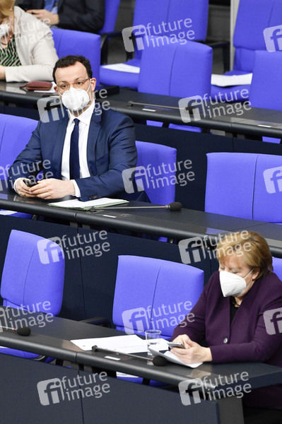 Jens Spahn und Angela Merkel in der 205. Sitzung des Deutschen Bundestages im Reichstagsgebäude. Berlin, 27.01.2021
