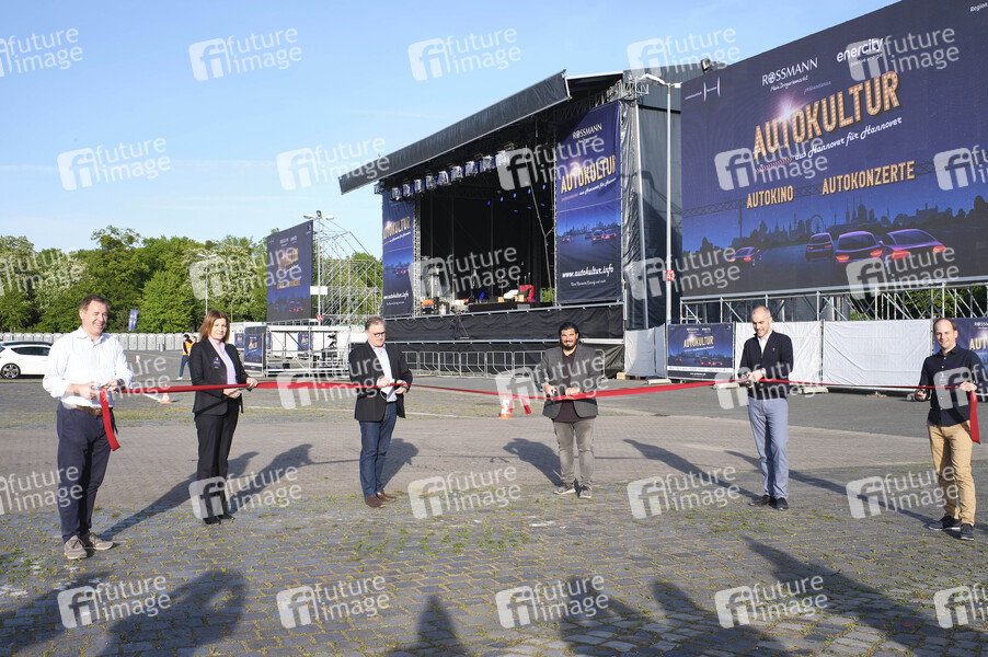 Markus Scheele (event it), Susanne Zapreva (Vorstandsvorsitzende von enercity), Hauke Jagau (Regionspräsident), Nico Röger (Hannover Concerts), Belit Onay (Oberbürgermeister von Hannover) und Raoul Roßmann (Unternehmer) eröffnen die erste Autokultur-Veranstaltung 'Die Pochers hier' auf dem Schützenplatz. Die Besucher verfolgen unter Berücksichtigung klarer Hygiene-Vorschriften während der Corona-Krise den Auftritt aus dem Auto. Hannover, 07.05.2020