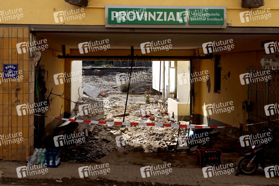 Nach dem Jahrhunderthochwasser in der Eifel durch heftige Regenfälle und Dauerregen mit Überschwemmungen und Überflutungen haben die Aufräumarbeiten im Ahrtal begonnen. Einheiten von Polizei, THW, Bundeswehr und Feuerwehr mitsamt vielen freiwilligen Helfern räumen Straßen, entfernen Schutt und Schlamm und versorgen die Menschen. Im Bild zerstörte Häuser in der Ortschaft Altenahr, in der die Flut viele Häuser zerstörte, 22.07.2021