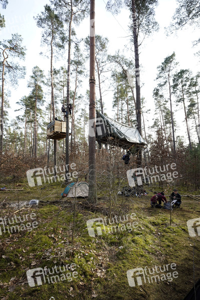 Das Protestcamp von Umweltaktivisten in Grünheide richtet sich gegen die Erweiterungspläne des Tesla-Werks. Die Aktivisten werfen Tesla vor, Umweltverstöße zu begehen, Trinkwasser zu gefährden und Abwasser-Grenzwerten zu überschreiten. Seit Donnerstag halten die Aktivisten einen Teil des Landeswaldes besetzt, den Tesla im Falle einer Erweiterung seines Geländes roden will. Sie haben um die zehn Baumhäuser in mehreren Metern Höhe errichtet und kündigten an, möglichst lange ausharren zu wollen. Auch die Bürgerinitiative Grünheide spricht sich gegen die Erweiterungspläne aus und zeigt sich mit den Besetzern solidarisch. Grünheide, 02.03.2024