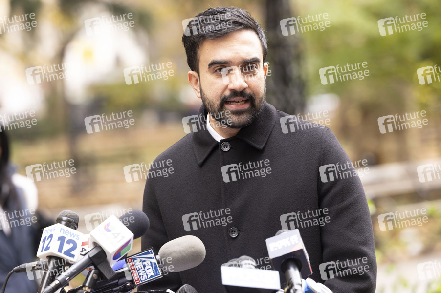 Zohran Mamdani bei einer Pressekonferenz im City Hall Park zu einem bevorstehenden Treffen mit dem US-Präsidenten in Weißen Haus. New York, 20.11.2025