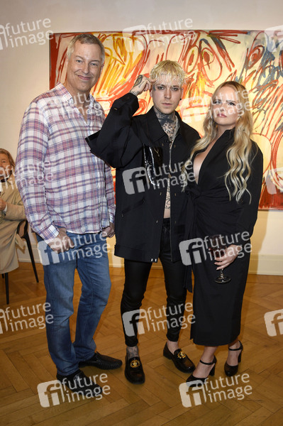 Thomas Hermanns, Alexander Höller und Svenja Reichert bei der Eröffnung der Alexander Höller Ausstellung 'F*CK THEM' in der Galerie Schmalfuss. Berlin, 19.08.2021