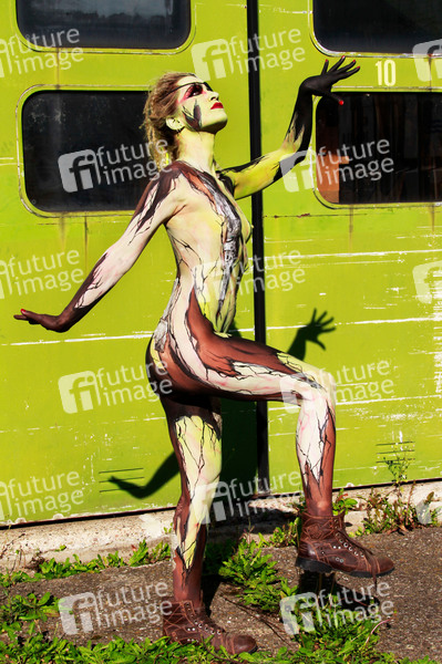 Bodypainting und Photoshooting mit Model Jutta auf einem Industriegelände in Hameln. Bodypaint-Künstler: Jörg Düsterwald, Make-Up und Hairstyling: Nadja Lück