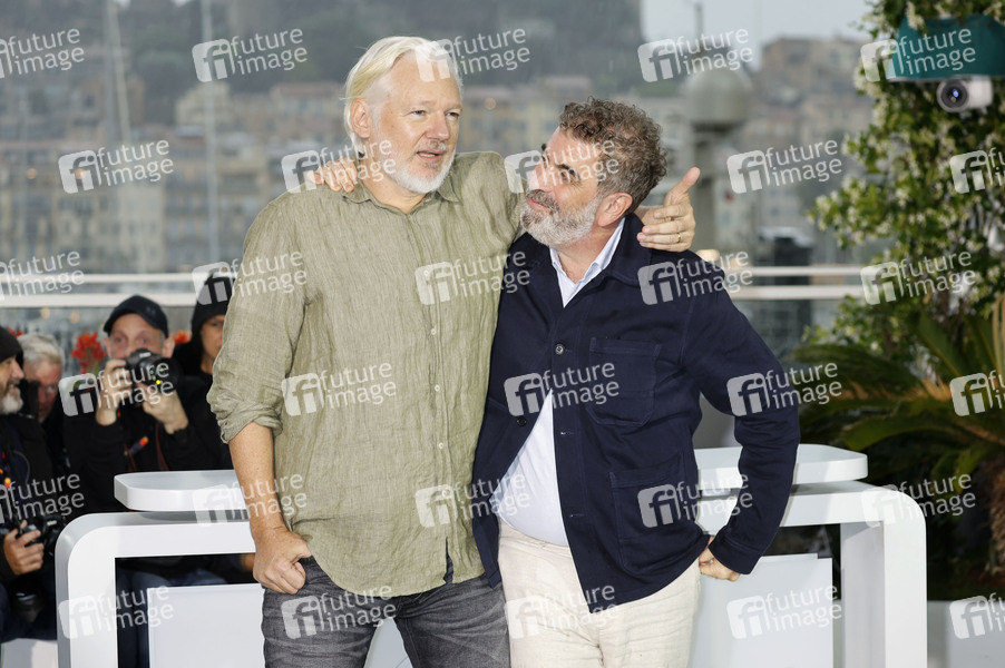Julian Assange und Eugene Jarecki beim Photocall zum Dokumentarfilm 'The Six Billion Dollar Man' auf dem Festival de Cannes 2025 / 78. Internationale Filmfestspiele von Cannes am Palais des Festivals. Cannes, 20.05.2025