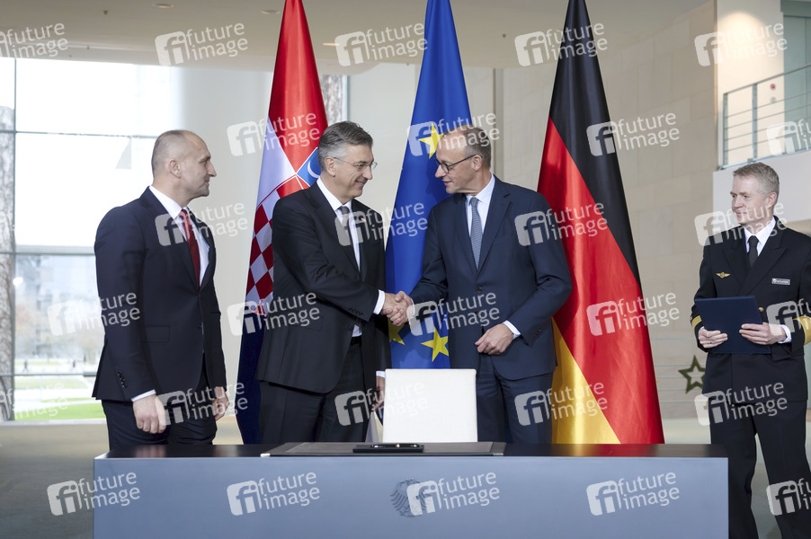 Andrej Plenkovic und Friedrich Merz beim Empfang des Premierministers von Kroatien mit militärischen Ehren zu einem gemeinsamen Gespräch mit anschließendem Pressestatement sowie der Unterzeichnung einer Absichtserklärung des kroatischen Verteidigungsministers Ivan Anusic im Bundeskanzleramt. Berlin, 10.12.2025