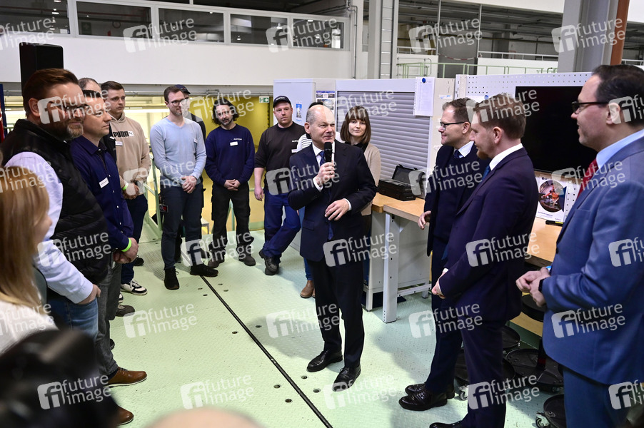 Olaf Scholz spricht während einer Informationsveranstaltung der Alstom Transportation Germany GmbH in einer Werkhalle mit den Mitarbeitern. Der deutsch-französische Rüstungskonzern KNDS übernimmt das Görlitzer Werk des Schienenfahrzeugherstellers Alstom. Görlitz, 05.02.2025
