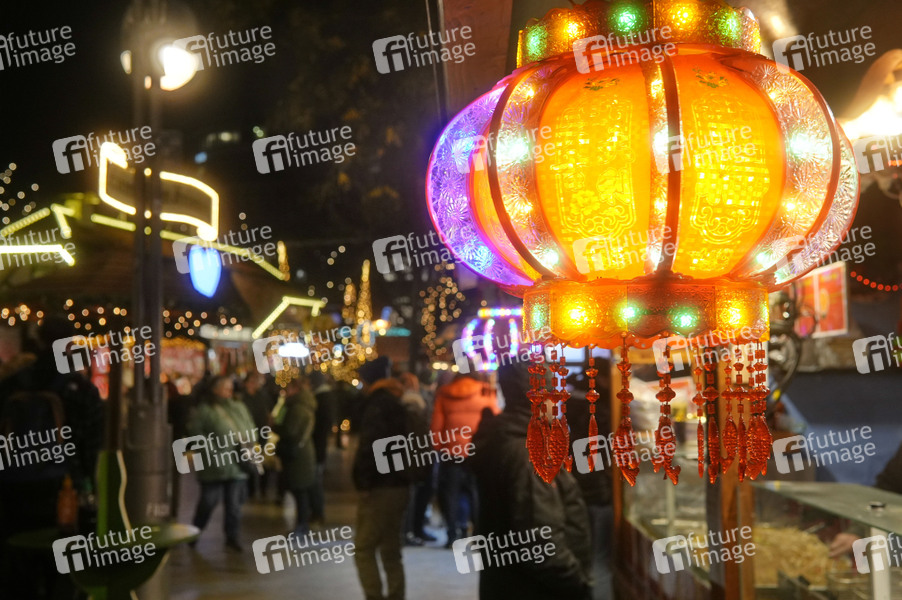 Asiatische Lampe auf dem City-Weihnachtsmarkt an der Gedächtniskirche auf dem Breitscheidplatz. Berlin, 16.12.2024