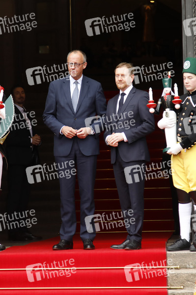 Friedrich Merz und Michael Kretschmer beim Antrittsbesuch des Bundeskanzlers im Freistaat Sachsen in der Sächsischen Staatskanzlei. Dresden, 28.10.2025