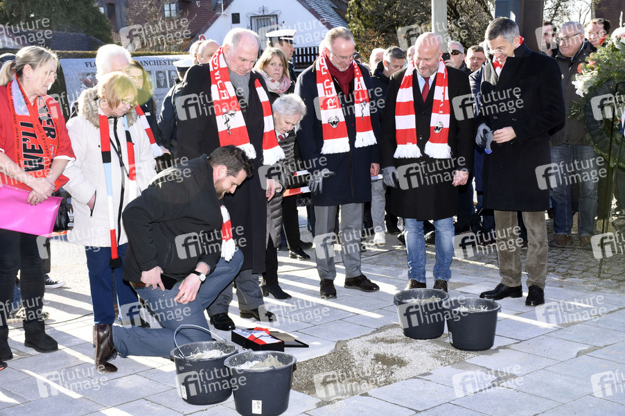 Uli Hoeneß, Karl-Heinz Rummenigge, Christian Vorländer und Herbert Haimer bei der Grundsteinlegung für eine Gedenkvitrine zum 62. Jahrestag des Flugzeugunglücks am damaligen Flughafen München-Riem, bei dem 23 Menschen ums Leben kamen, darunter acht Fußballspieler von Manchester United, am Manchesterplatz. München, 06.02.2020