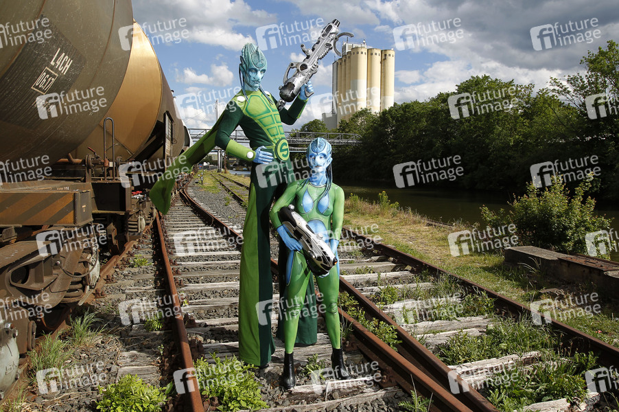 Cosplay, Cosplayer, Bodypainting, Body-Painting, Make-up, Latexappliaktionen, Maskenbildnerei, Körperkunst, Körperfarben, Projekt Farbkörper, Farbe, Bemalung, Kunst, Malerei, Außerirdische, Besucher, Invasion, Science Fiction, nackt, Erkundung, Bahn, Gleise, Bahngleise, Waffe, Waffen, Strahlengewehr, Waggons, Bahnwaggon, Güterbahnhof, body painting, body art, project color body, colors, nude, naked, alien, aliens, tracks, railroad tracks, wagons, railway wagons, freight station, weapon, weapons, ray gun, vistor, visitors