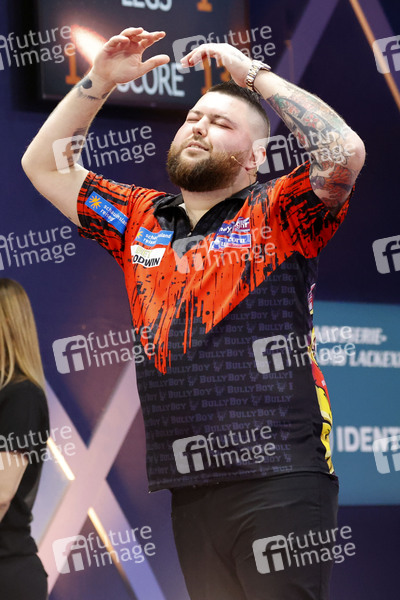 Michael Smith / Bully Boy bei der Promi-Darts-WM 2023 im Maritim Hotel. Düsseldorf, 07.01.2023