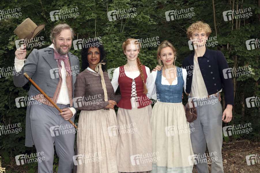 Stephan Grossmann, Dennenesch Zoude, Valerie Sophie Körfer, Stefanie Stappenbeck und Justus Czaja beim Pressefototermin am Set des Märchenfilms 'Das Märchen vom goldenen Taler' für die ARD-Märchenreihe 'Sechs auf einen Streich' im Museumsdorf Düppel. Berlin, 08.07.2020