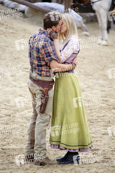 Raul Richter und Larissa Marolt beim Pressetermin der Karl-May-Spiele 2019 mit Szenen aus 'Unter Geiern - Der Sohn des Bärenjägers' im Freilichttheater am Kalkberg. Bad Segeberg, 21.06.2019