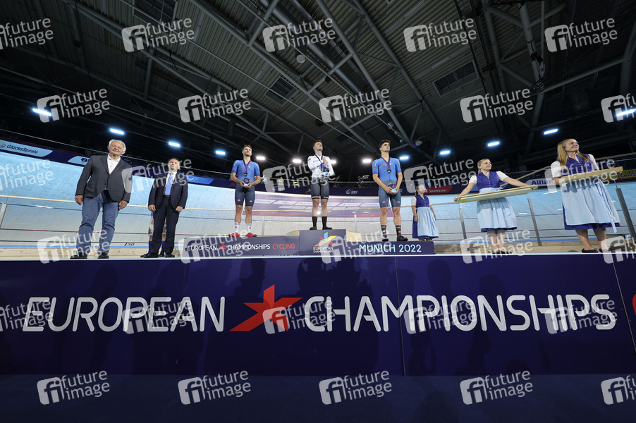 Davide Plebani, Nicolas Heinrich und Manlio Moro bei der Siegerehrung Finale Einerverfolgung Herren bei den European Championships 2022 im Bahnradsport in der Messe München. München, 13.08.2022