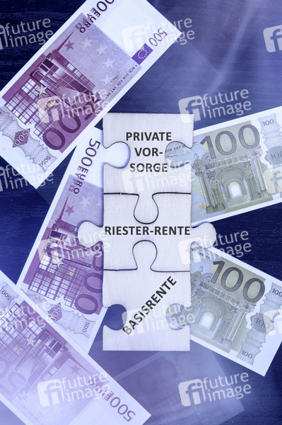 Geldscheine liegen unter Puzzlestücken zur Altersvorsorge.