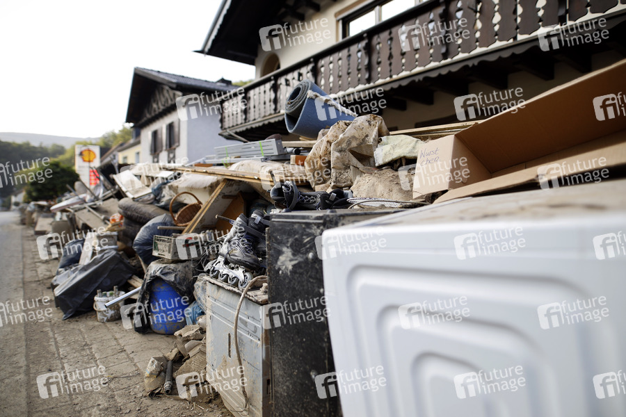 Nach dem Jahrhunderthochwasser in der Eifel durch heftige Regenfälle und Dauerregen mit Überschwemmungen und Überflutungen haben die Aufräumarbeiten im Ahrtal begonnen. Einheiten von Polizei, THW, Bundeswehr und Feuerwehr mitsamt vielen freiwilligen Helfern räumen Straßen, entfernen Schutt und Schlamm und versorgen die Menschen. Im Bild Flutmüll in der Ortschaft Altenahr, in der die Flut viele Häuser zerstörte, 22.07.2021