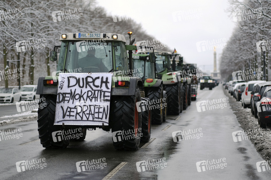 Erneut protestieren Bauern (u.a. Initiative 'Land schafft Verbindung') mit ihren Fahrzeugen in Berlin gegen Umwelt- und Tierschutzgesetze (u.a. Düngeverordnung) und für höhere Lebensmittelpreise. Berlin, 30.01.2021