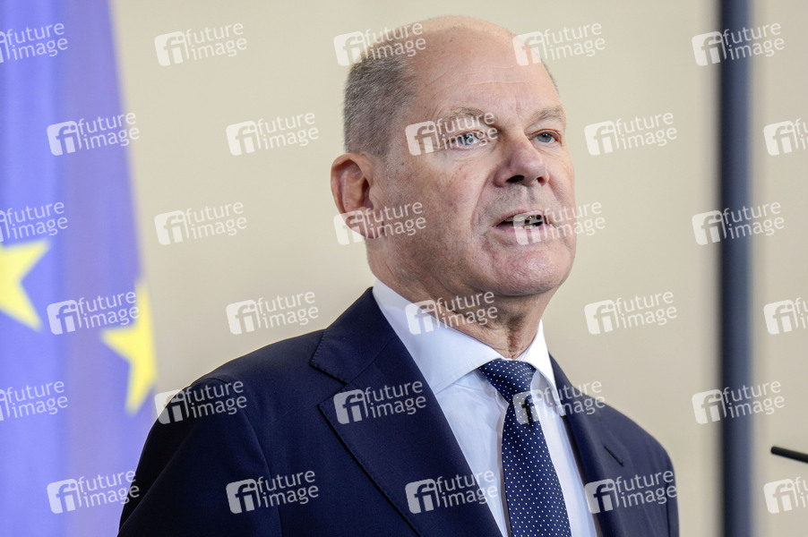 Olaf Scholz beim Pressestatement nach dem bilateralen Gespräch des amerikanischen Präsidenten mit dem Bundeskanzler im Bundeskanzleramt. Berlin, 18.10.2024
