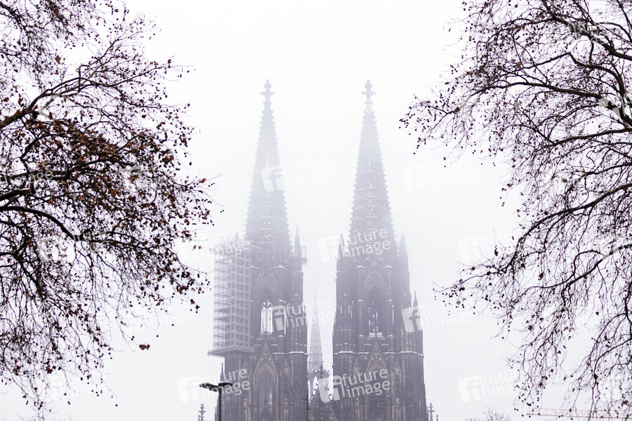 Schnee, Winter, Nebel, Hochnebel, vernebelt, Sichtweite, gefrierende Nässe, Wettervorhersage, Missbrauchsgutachten, Gutachten, Krise im Erzbistum, Wetter in NRW, kalt, Frost, Kälte, Wetteraussichten, Kirchensteuer, Kirchentag, Kirchenaustritt, Kirchenaustritte, Kirchen-Skandal, Katholische Kirche, Evangelische Kirche, Jesuiten, Religion, Glaube, Vatikanisches Konzil, Jesus, Christus, Erzbistum, Religionsfreiheit, Kreuzblume, Domspitze, Domkapitel, Domschiff, Domkloster, Domplatte, Kardinal-Höffner-Platz, Nachbildung, Westfassade, Domumfeld, Hohe Domkirche St. Petrus, Kölner Sehenswürdigkeit, Wahrzeichen, Tourismus, Stadtbesichtigung, Stadtrundfahrt, Sightseeing, Fremdenverkehr, Reiseverkehr, Kultur-Urlaub, Kathedrale, Stadtbesucher, KölnTourismus, Kirche, Dom, Kathedrale des Erzbistums Köln, Höhe 157.38 Meter, Neugotik, Hohe Domkirche Sankt Petrus, römisch-katholische Kirche, unter dem Patrozinium des Apostels Petrus, Domführungen, Geheimnis Kölner Dom, Kirchenzugehörigkeit, Konfession, Kommunion, Firmung, Taufe, Taufpate, Christen, Christentum, Glaubenskrise, kirchliche Trauung, orthodoxe Kirche, Sakrament, Sakramente, Sakrileg, 10 Gebote, Dogma, Dogmen, Zwillingstürme, Domspitzen, Kirchen-Skandal, Exkommunikation, Erzbischof, Papstbrief, Litterae, Salbung, Synode, Beichte, Beichten, Ablass, Ablasshandel, Sünde, Vergebung, Christianisierung, Abendland, Europäische Kultur, Kulturgeschichte, Baugerüst, Renovierung, Instandhaltung, Symbolbild, Symbolfoto