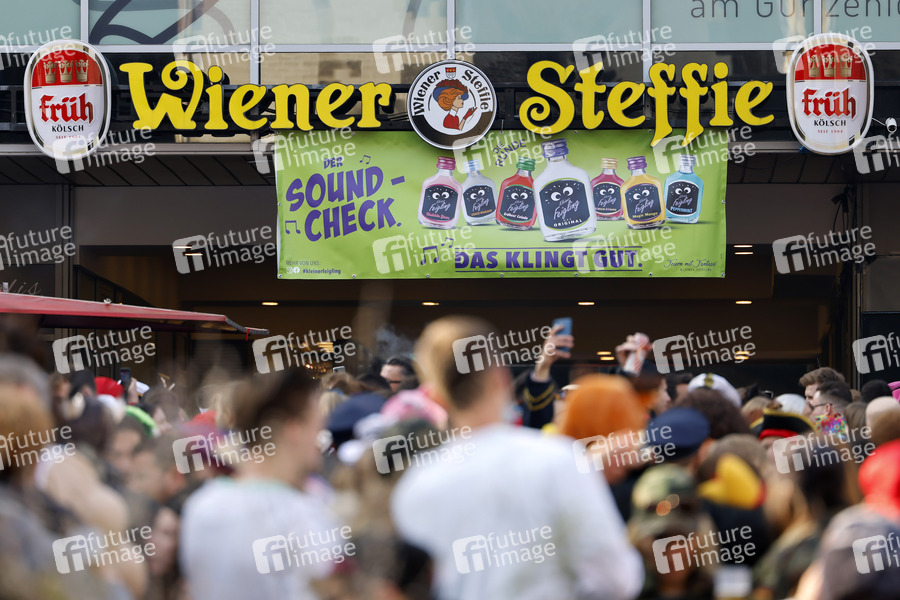Jecken und Narren im Kostüm bei der Sessionseröffnung des Kölner Karneval am Elften Elften in der Kölner Innenstadt vor dem Kultlokal Wiener Steffie. Der Kölner Karneval steht diesmal ganz im Zeichen von Corona, Teile der Altstadt dürfen nur nach der 2G-Regel betreten werden, das Kölner Dreigestirn ist nach einem positiven Test in Quarantäne. Köln, 11.11.2021