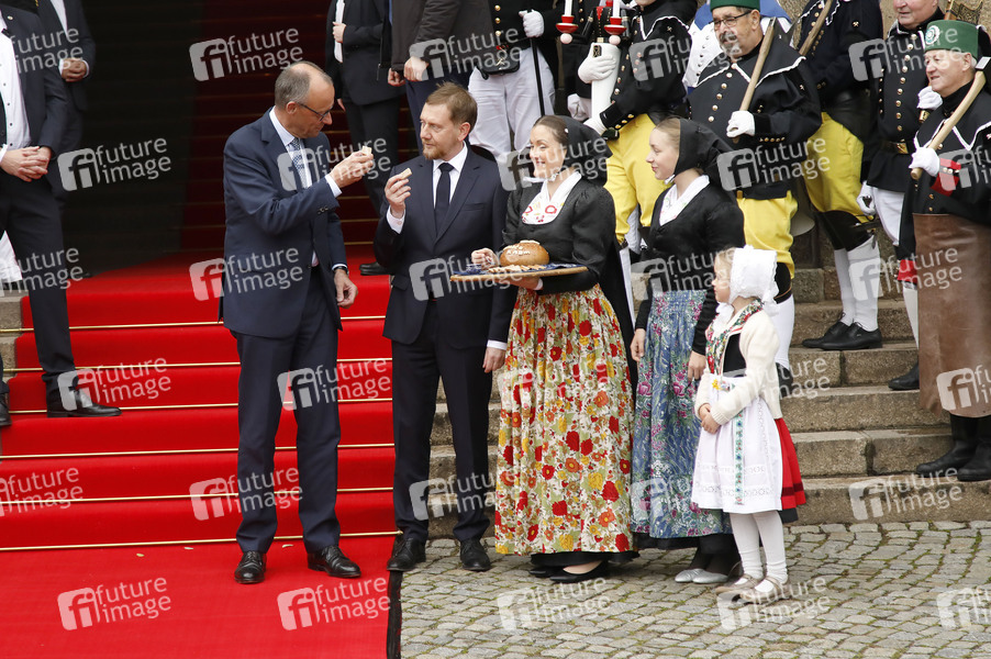 Friedrich Merz und Michael Kretschmer beim Antrittsbesuch des Bundeskanzlers im Freistaat Sachsen in der Sächsischen Staatskanzlei. Dresden, 28.10.2025