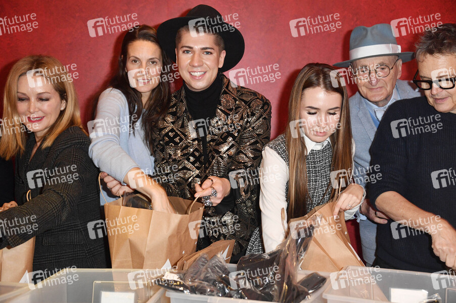 Sibel Brozat, Katrin Wrobel, Maximilian Seitz, Kassandra Kaven, Günther Krabbenhöft und Rolf Scheider bei der Veranstaltung 'Strassenfeger x Maximilian Seitz - Weihnachtsgeschenke einpacken für Obdachlose und Bedürftige' im Hotel Q!. Berlin, 08.12.2021