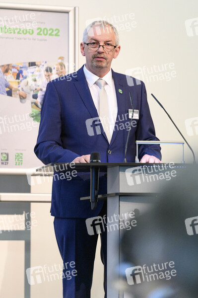 Norbert Holthenrich (Präsident des Zentralverbands Zoologischer Fachbetriebe e.V. - ZFF) bei einer Presskonferenz zur Leitmesse für die internationale Heimtierbranche 'Interzoo 2022' im Messezentrum. Nürnberg, 24.05.2022