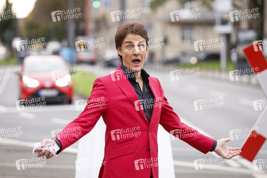 Matze Knop macht Passanten und Autofahrer an der Ampel am Ubierring auf sein neues Programm 'Matzeknopien' aufmerksam. Köln, 11.10.2019
