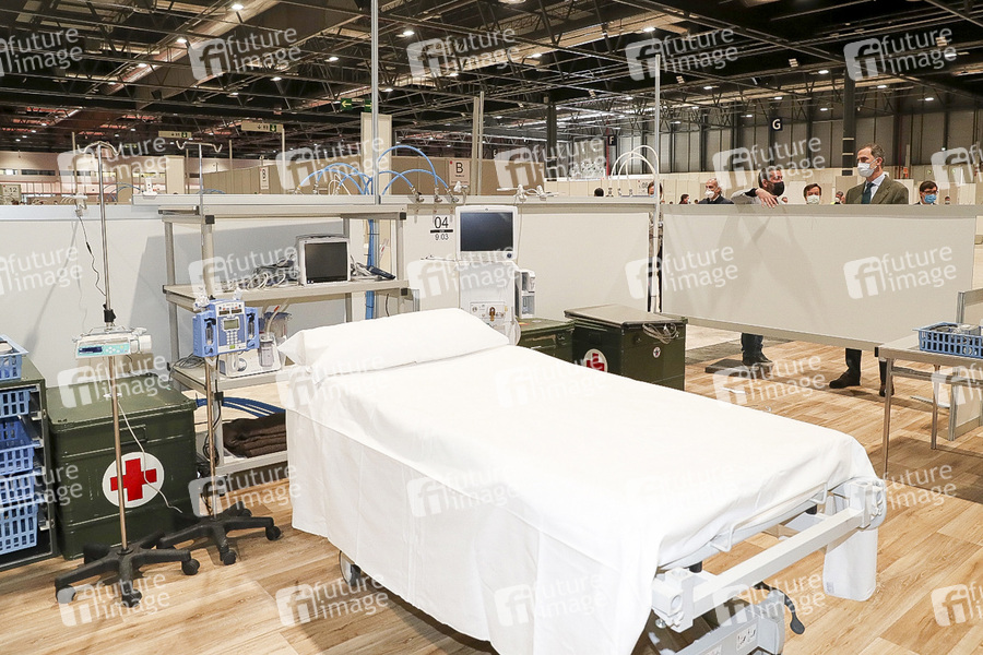 Notkrankenhaus, Kankenhaus, Klinik, Versorgung, Gesundheitssystem, Hilfe, Coronaviren, Virus, Viren, Corona, Covid-19, Coronavirus, Coronaviren, Corona-Virus, Corona-Viren, Ansteckungsgefahr, Epidemie, Pandemie, Infektion, Infektionen, Krankheit, Vorbeugung, Ausnahmezustand, Maßnahmen, Neuansteckungen, Coronamaßnahmen, Corona-Infektion, Corona-Infektionen, Adel, König von Spanien, Staatsoberhaupt, Fürst von Asturien, Fürst von Girona, Felipe de Borbón, Monarch, Royal