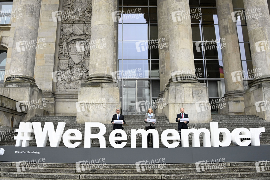 Mickey Levy, Bärbel Bas und Wolfgang Sobotka bei den Pressestatements von Wolfgang Sobotka, Mickey Levy und Bärbel Bas am Schriftzug #WeRemember zur Erinnerung an die Millionen im Nationalsozialismus ermordeten Juden vor dem Reichstagsgebäude. Berlin, 25.01.2022